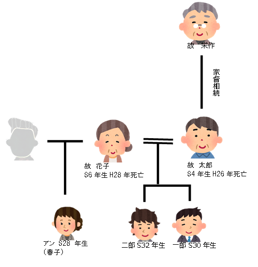 そして、この花子さんには、太郎さんと結婚する前に「春子さん」という娘がいました。春子さんは、生まれてすぐアメリカ在住の田中守氏夫婦の養子となり、後にアメリカ国籍を取得して名前を「アンさん」に変えていました。